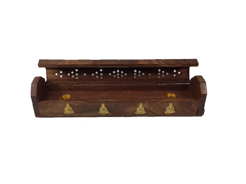 Buddha 12 inch box has holes for incense and 2 cone burners with storage in the bottom. Hand Crafted in India made from Sheesham Wood with inlaid brass design.