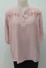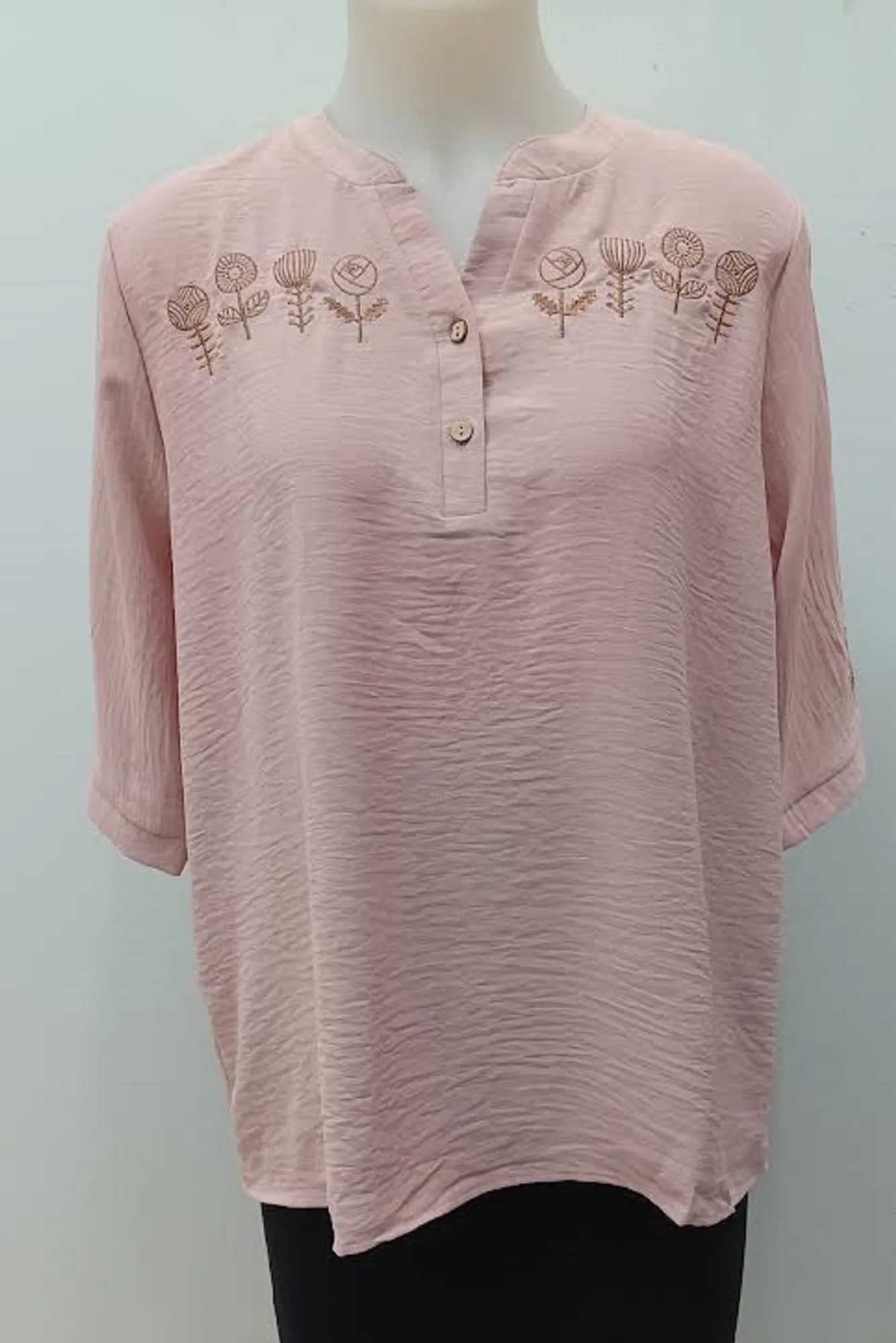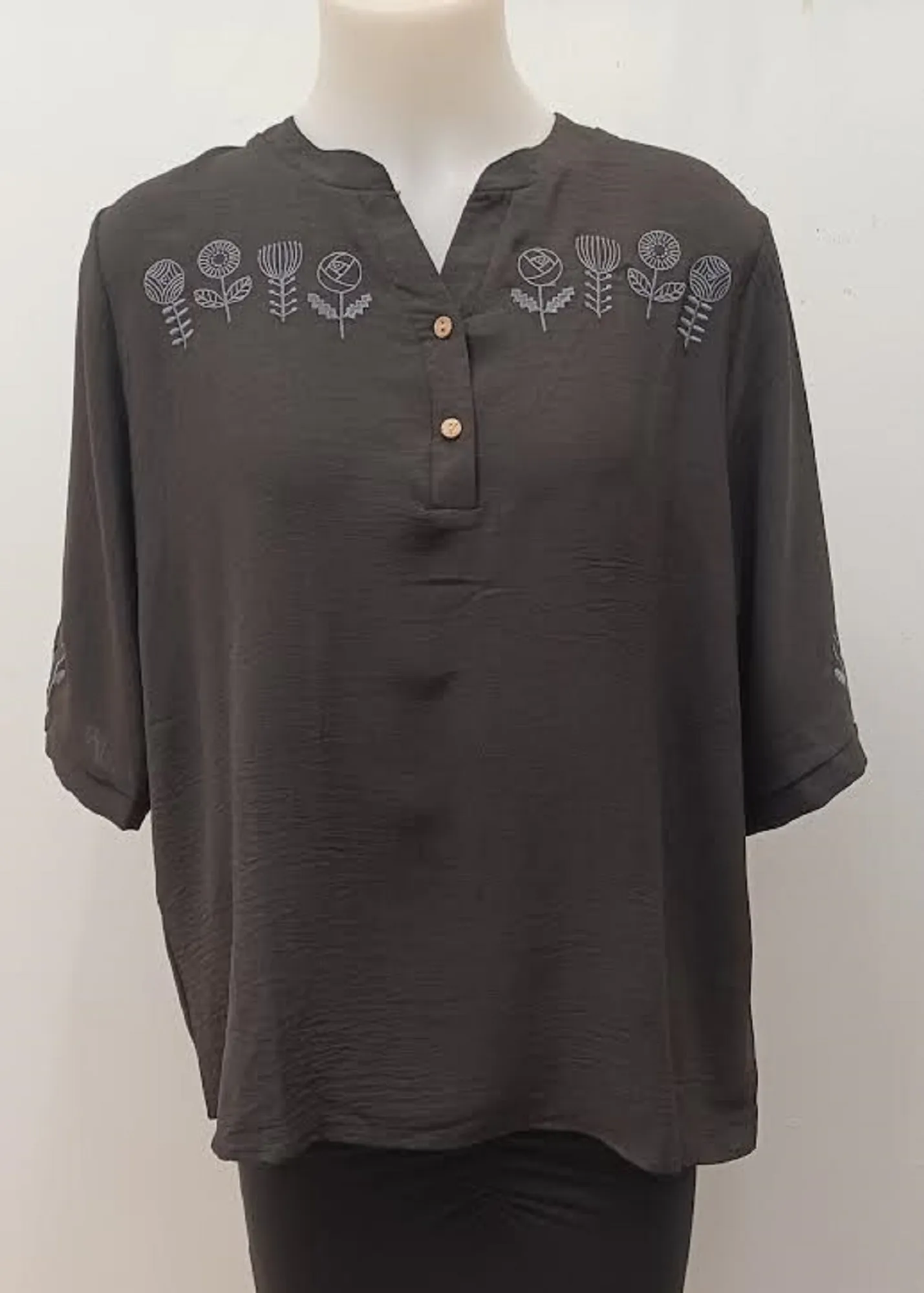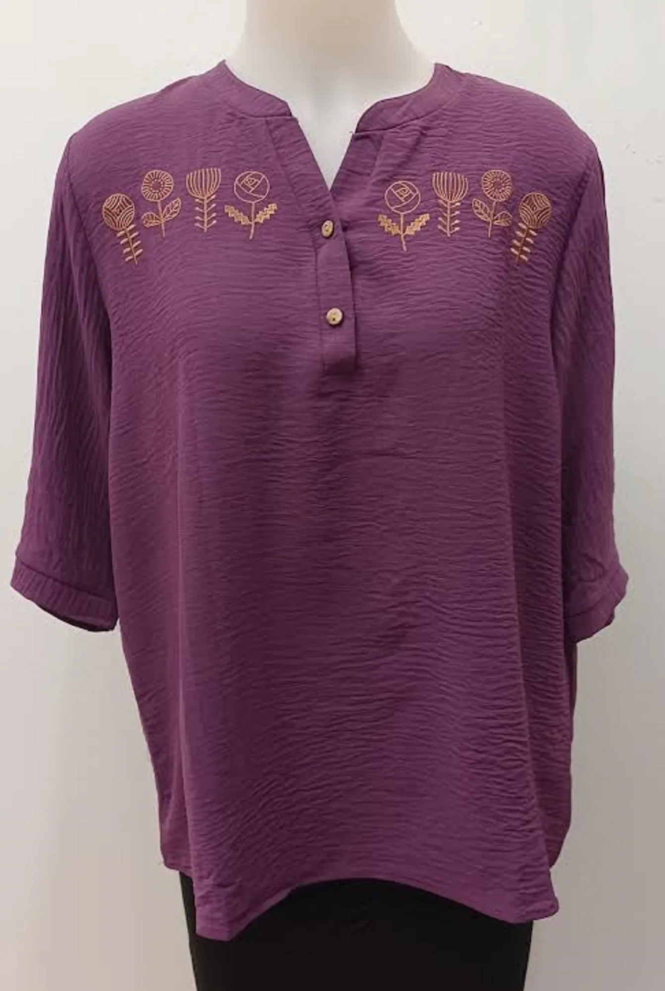 Cotton blend button shirt, with floral motif. 3/4 sleeve.
