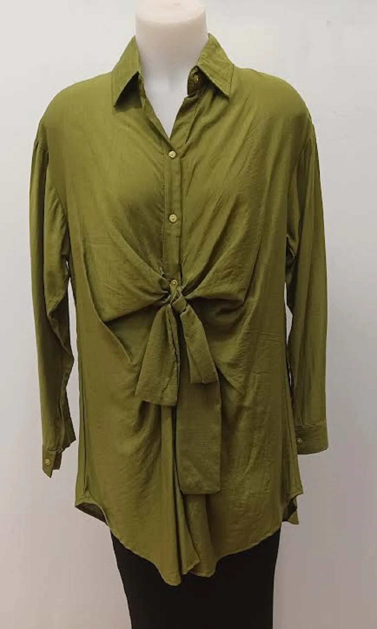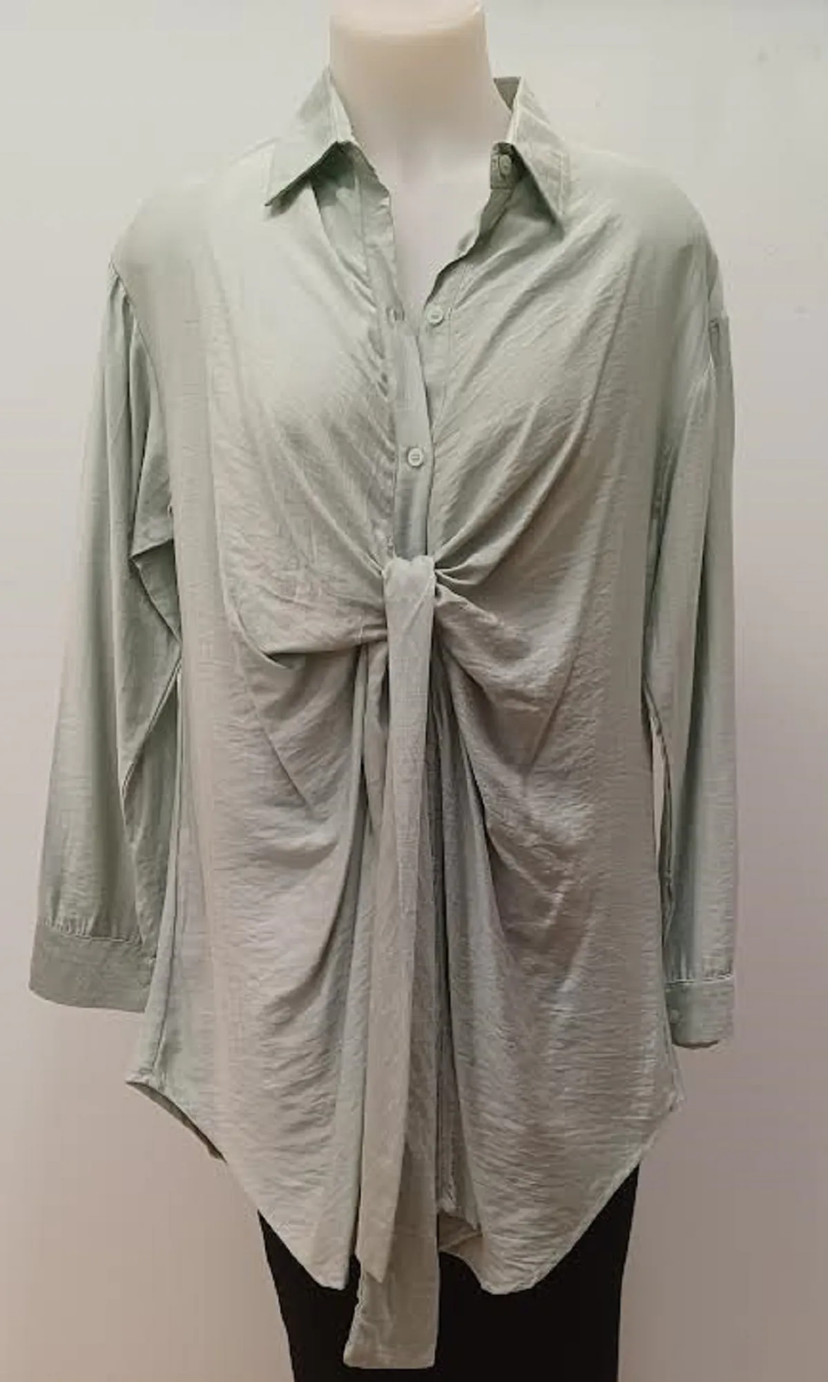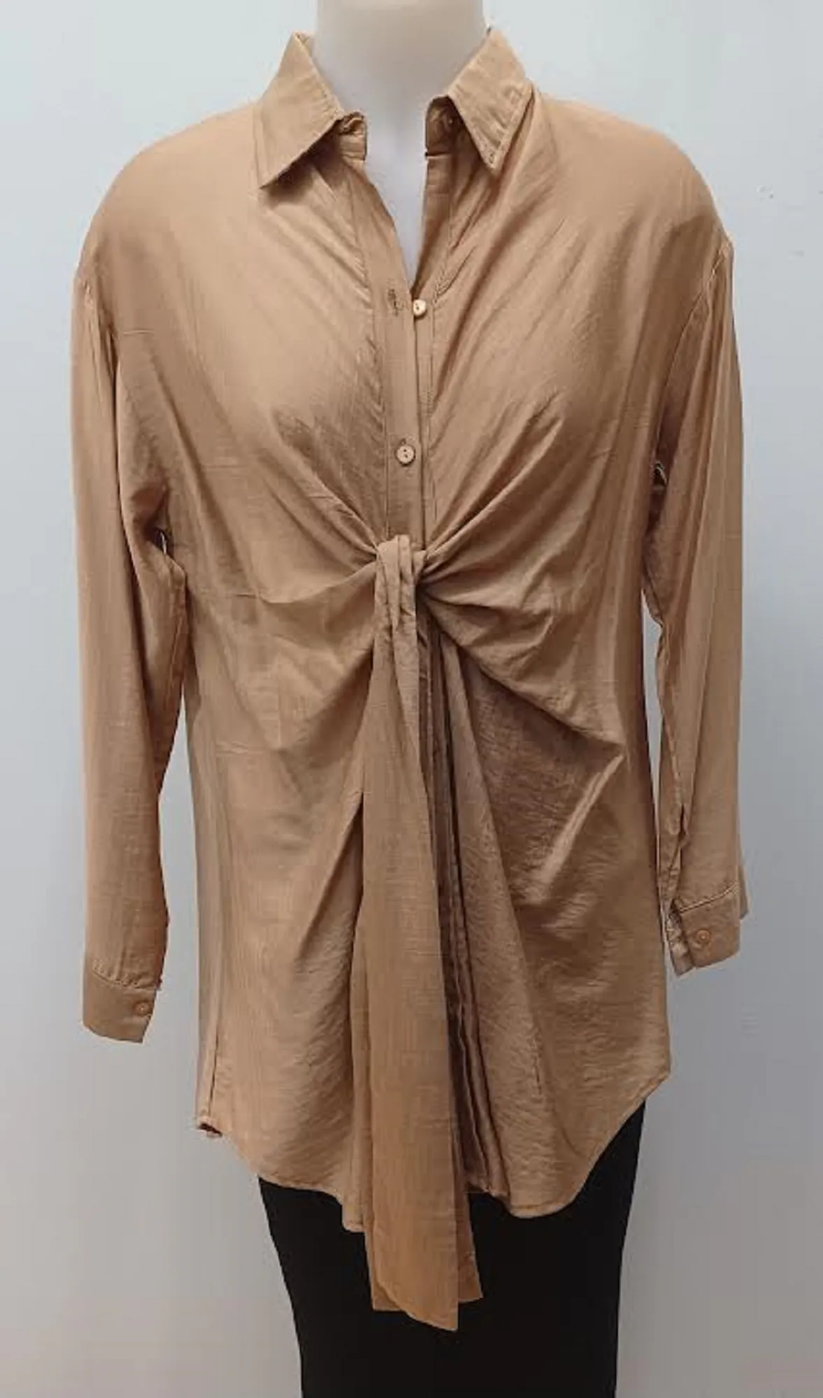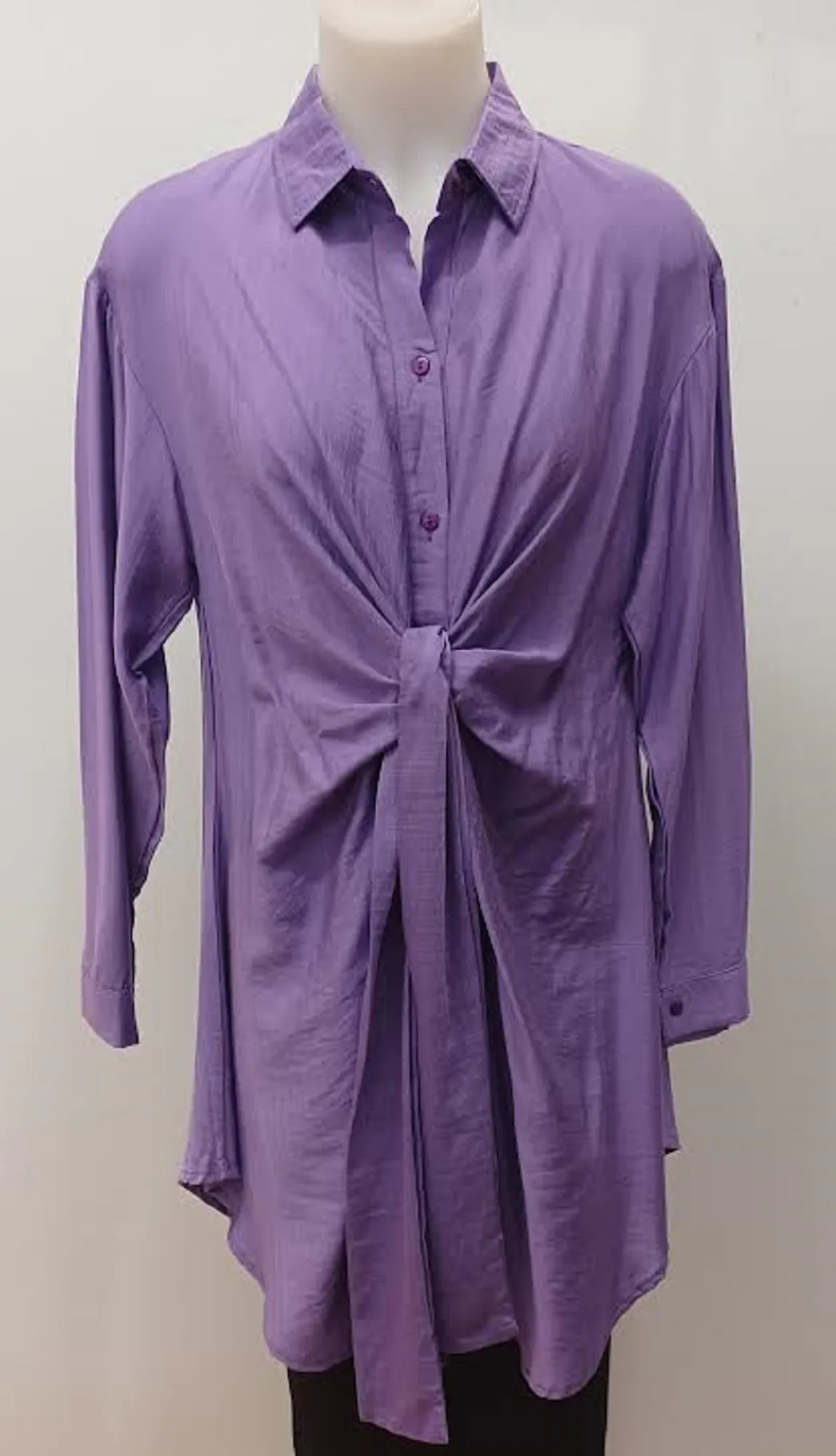 Long Silk/Polyester Shirt with Button Cuffs. Has each tie in front of shirt to tie up in front. Can be worn as shirt or dress. Super comfy and soft.