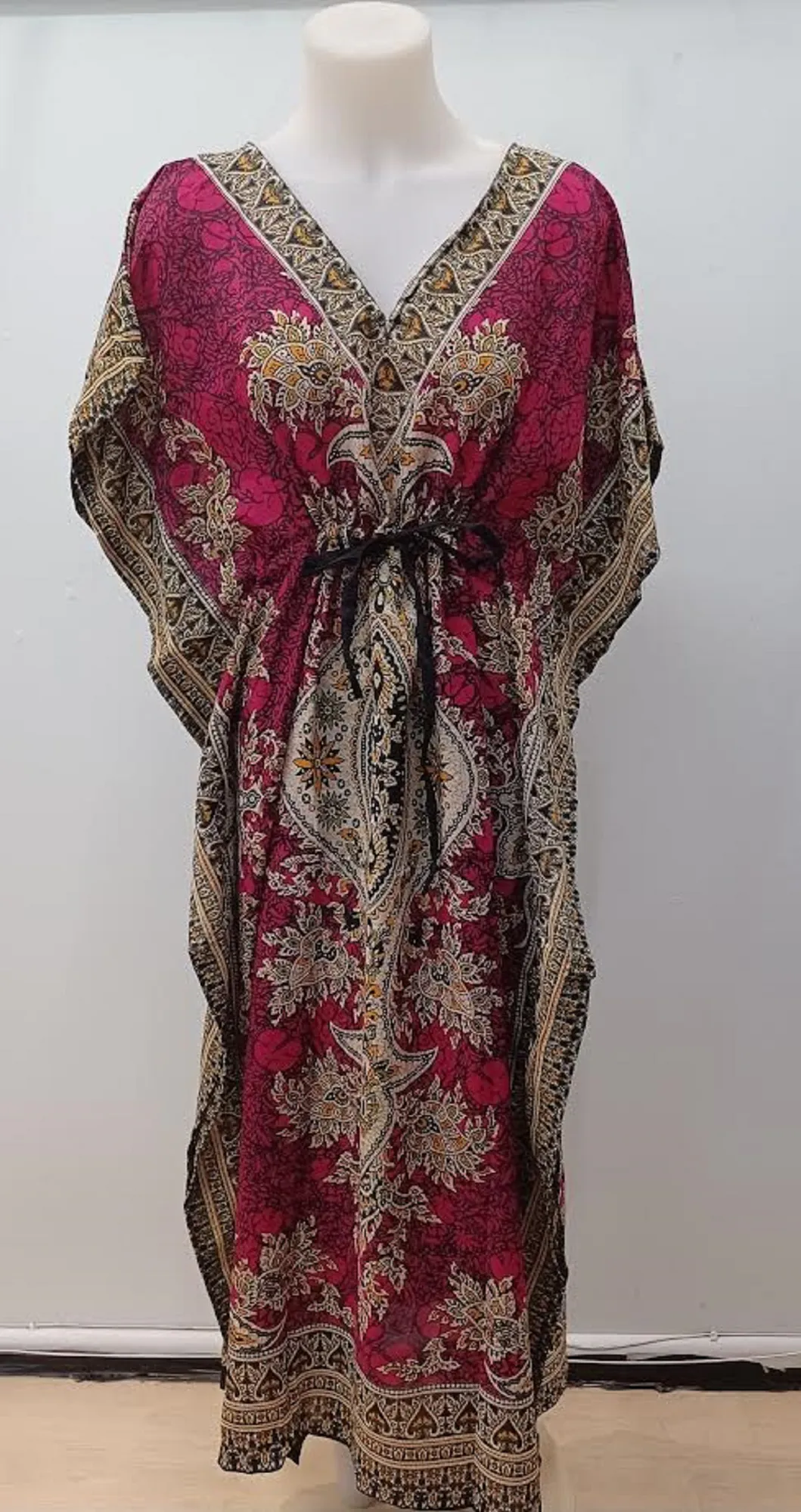 Long floral Kaftan with pull-tie at waist. Can be worn on its own or over swimsuit or other clothing.