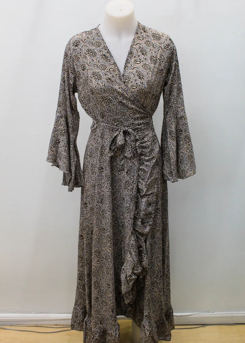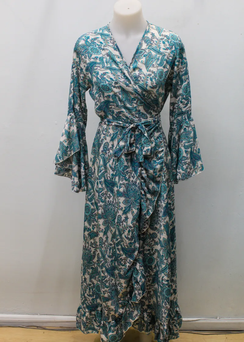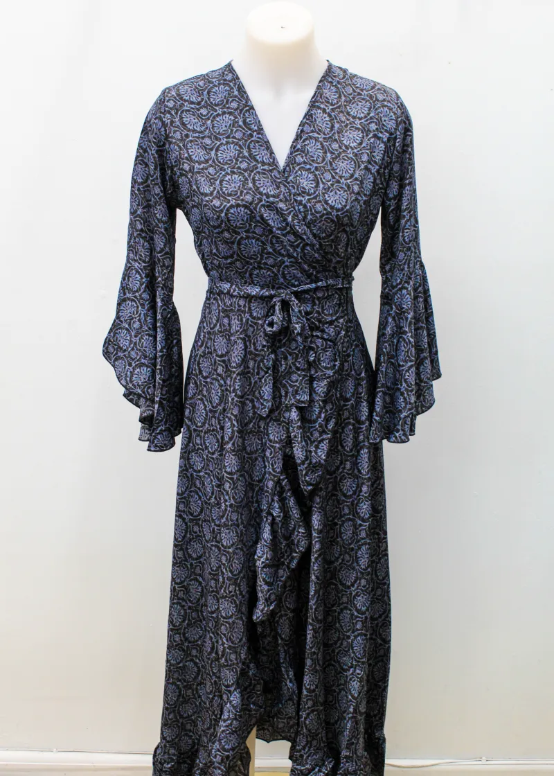 Marigold Lane wrap dress with hi-low ruffled skirt front, adjustable waist ties and flute sleeves. 70% silk 30% Polyester.
