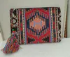 Upholstery tribal pouch bag with beaded tassel attachment and zipper fastening.