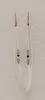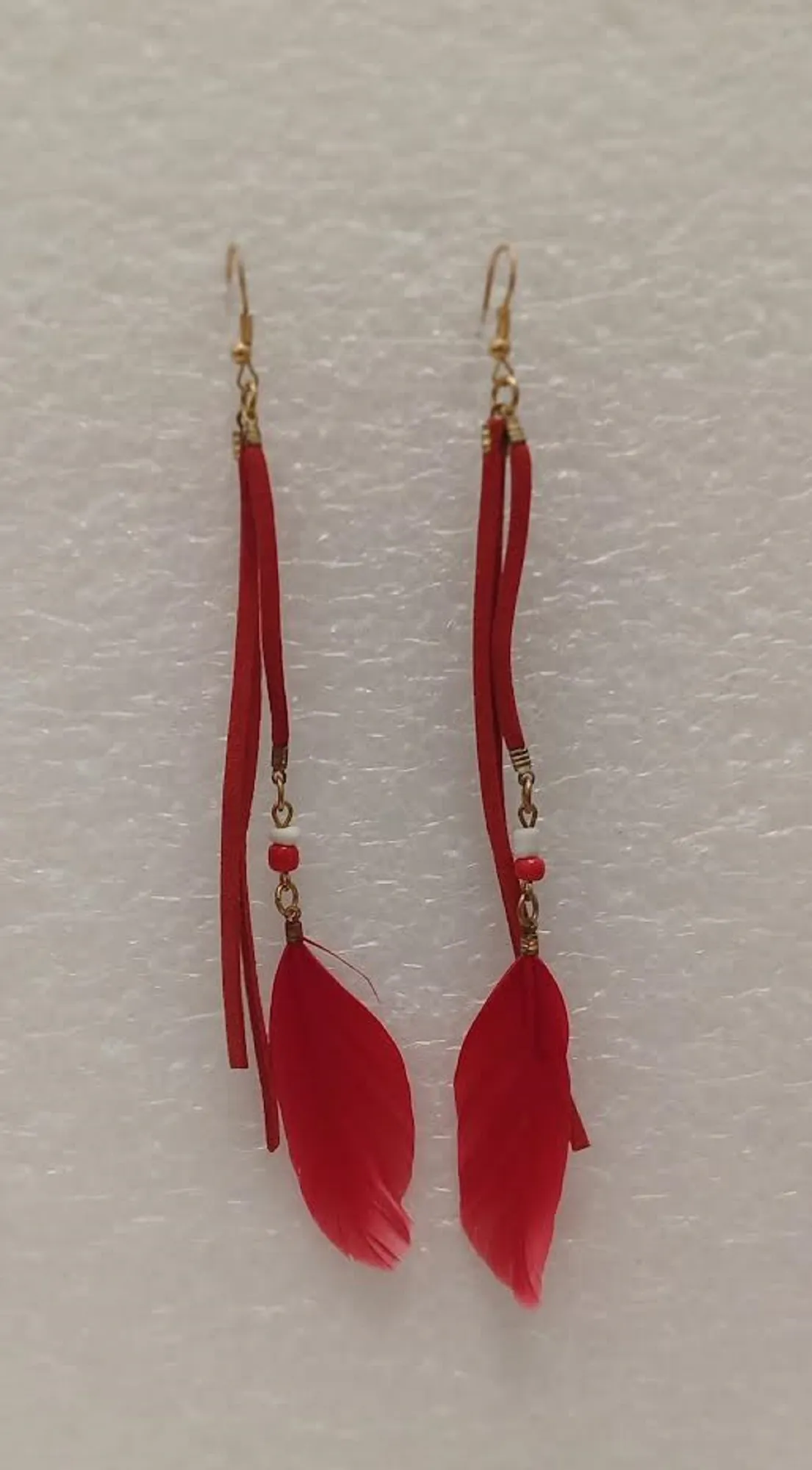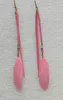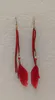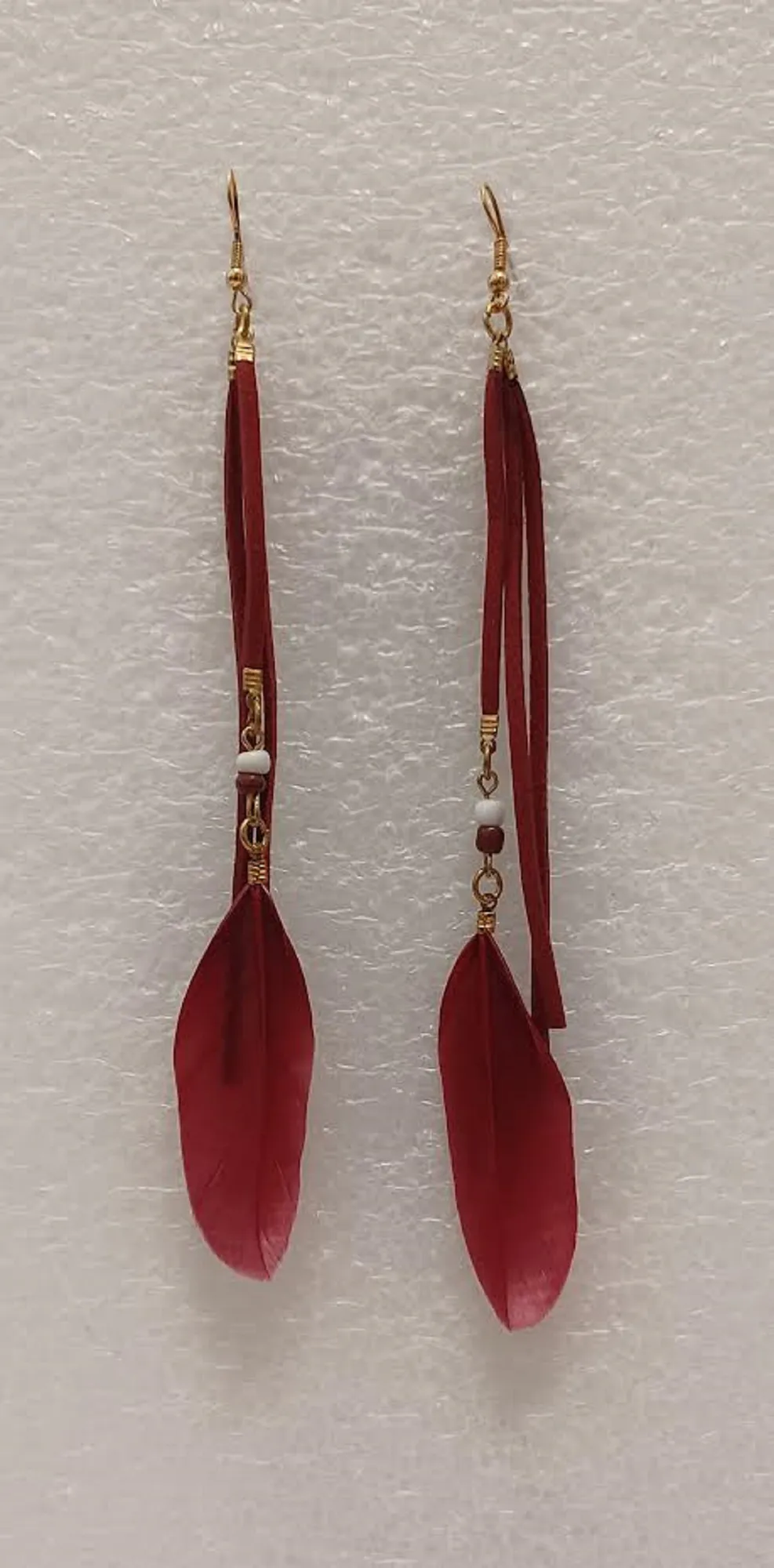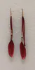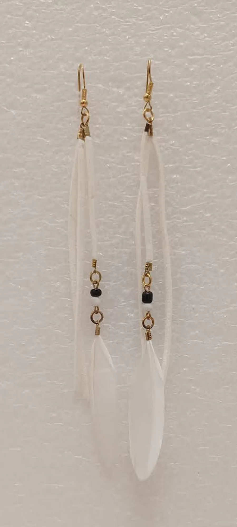 Long feather and leather drop earrings on silver metal earring hooks. 14.5 cm drop from ear.