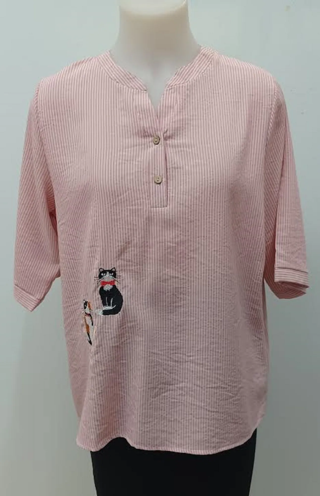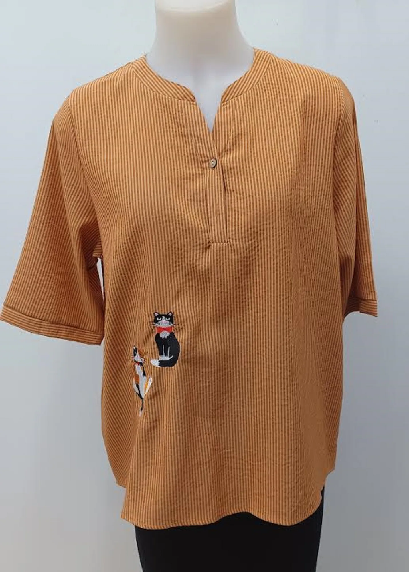 Cotton stripy button shirt with 3/4 length sleeves. Cute double cat embroidery on the front of shirt.