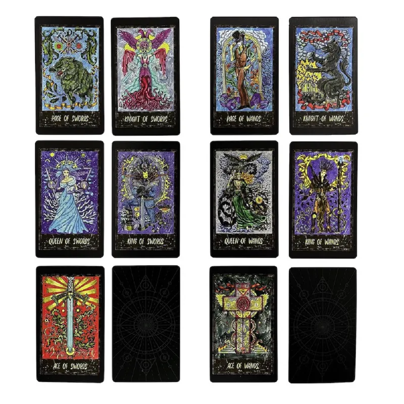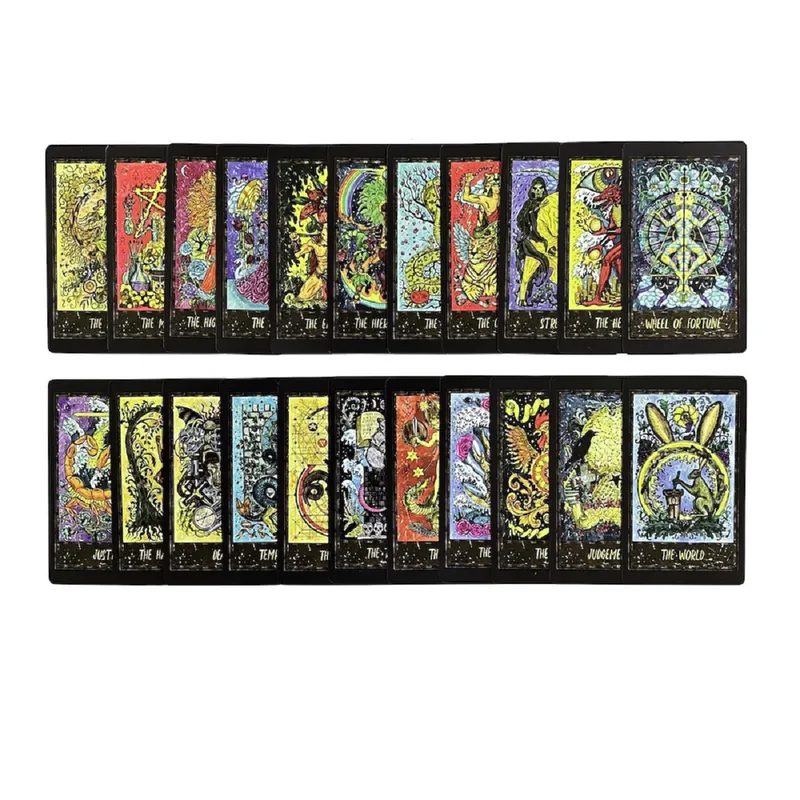 Deck of 78 cards with 22 major arcana and 56 minor arcana. Artwork by Vera Petruk. The Magic Gate Tarot Deck is a bridge between the world of humans and the Unknown. The cards will show you the hidden paths leading to the Secret Knowledge, they are the mirror of truth, the enchanting key to the power of your potentials and locked skills, the touch of Mystery. There are 78 hand drawn illustrations , including 22 major arcana cards and 56 ones of minor arcana. The deck is designed so that it can be read using traditional Rider Waite meaning, but both beginners and professional readers will find the new experience. Each card showcases the unique symbolic monochrome picture, blending the traditional occult symbols like freemasonry pyramid or Aquarius zodiac sign and fantasy imaginary symbols of animals and alchemy signs.