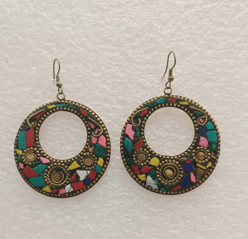 Brass plated hoop earrings, with multi-coloured tiles. Earrings hooks.